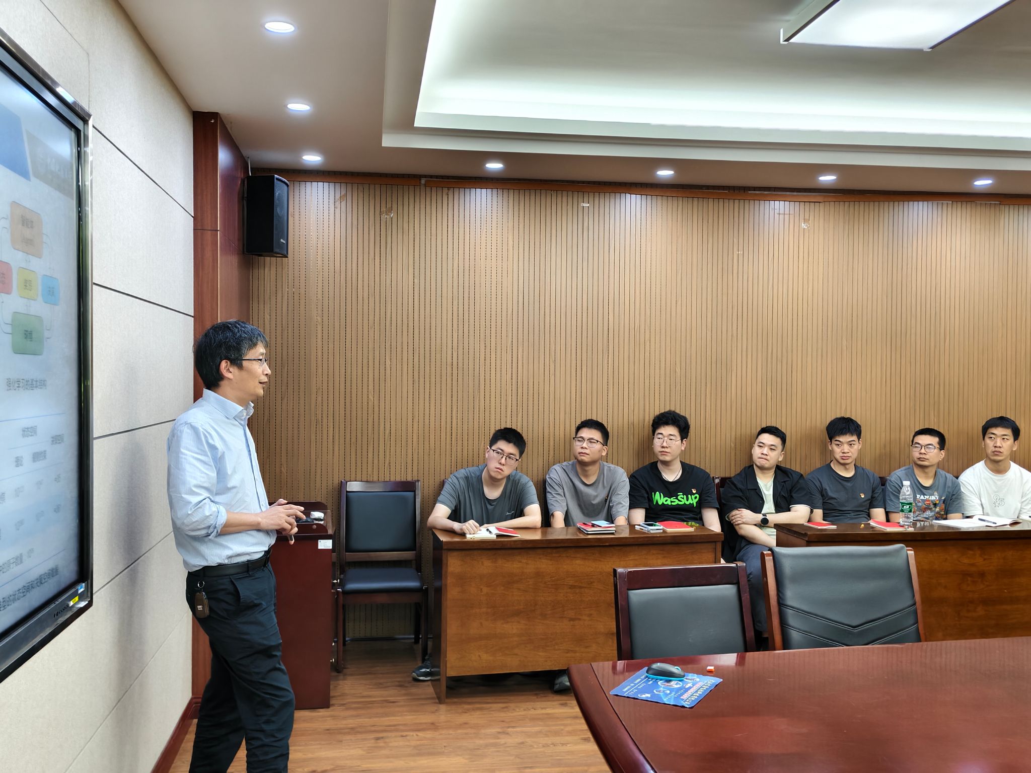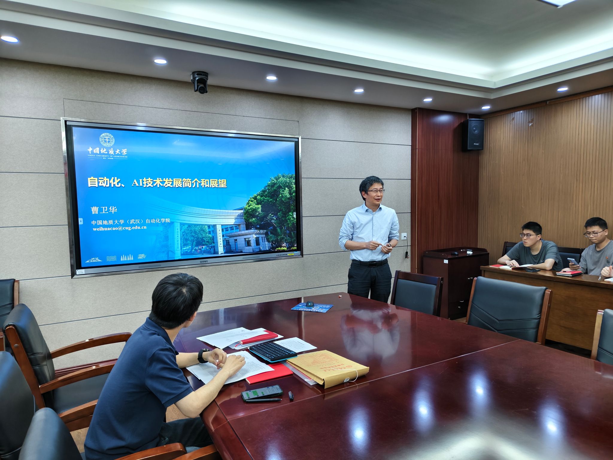 本次专题党课学习中,曹院长从自动化专业前沿背景出发,以自动化技术的发展、自动化与AI技术的应用、AI技术发展的挑战等方面为切入点,与支部成员展开深入交流与讨论。曹院长指出,在人工智能技术高速发展的当下,探索新工科建设之路需要“破局之举”,在延续传统学科优势基础上,从存量改革到学科交叉,从专业设置到结构调整,要兼顾守正与创新,探索“AI+地质”“AI+自动化”跨学科融合新模式,夯实行业基础的同时,以人工智能技术和机制革新培育面向未来的生命力。