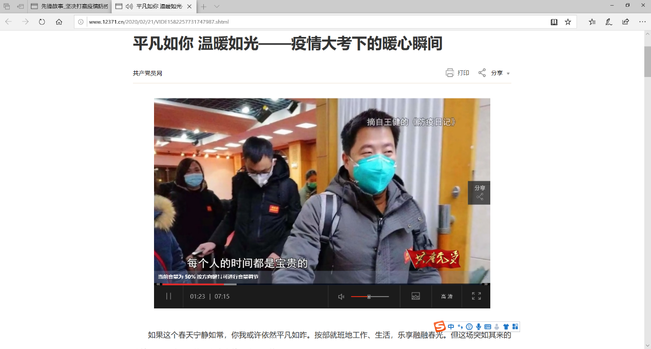 随后,王婕同志带领党支部成员学习疫情防控工作中的先进人物事迹。以浙江衢州“带班妈妈”张一萍同志先进事迹为例,引导党支部“学先进、跟先进、当先进”,把党员的初心和使命体现在生活中的点点滴滴。然后,大家一起观看了《平凡如你、温暖如光——疫情大考下的暖心瞬间》短视频,虽然有时候我们到不了疫情的最前线,但我们可以用自己的方式去奉献社会,当好一颗螺丝钉。