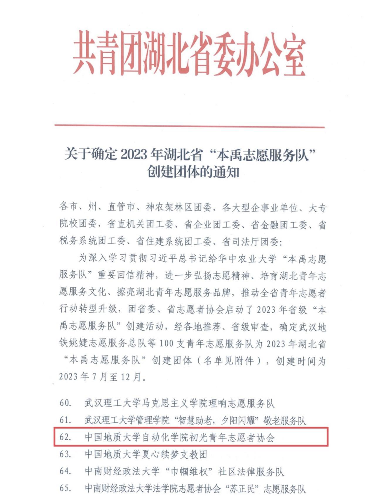 近日,团省委、省志愿者协会印发了2023湖北省“本禹志愿服务队”创建团队(名单),必赢官网“初光”青年志愿者协会成功入选!