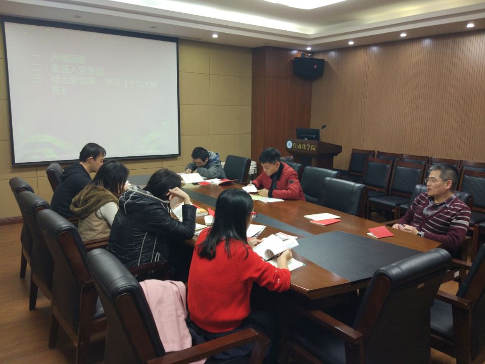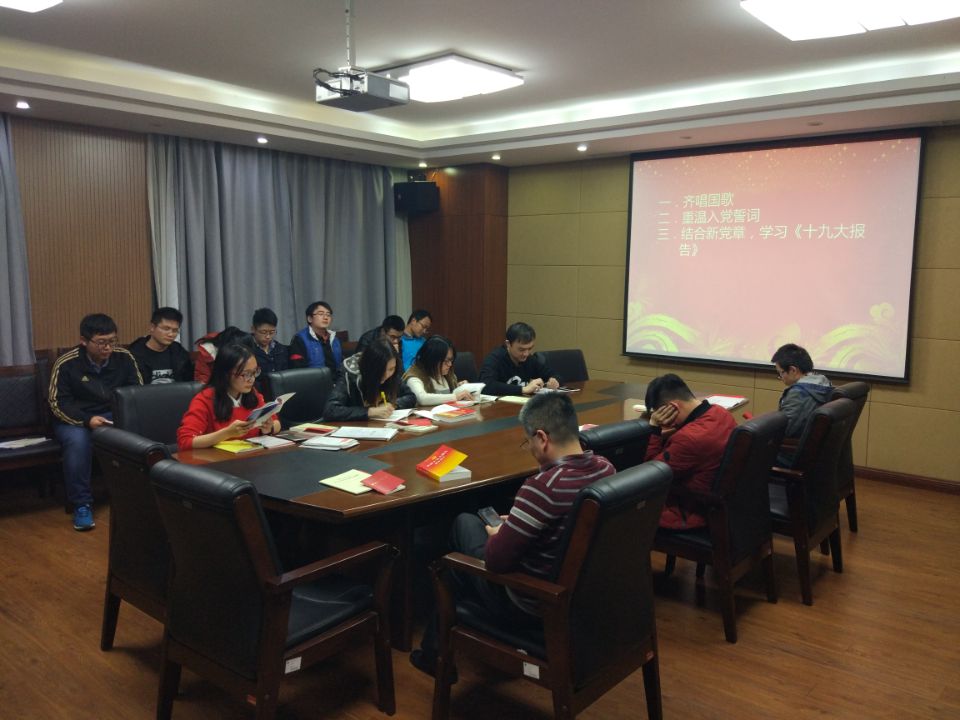 本次主题党日会议由党支部书记李美柳同志主持召开。首先,李美柳同志介绍了本次会议的主要内容和相关流程并带领大家唱国歌、宣读入党誓词。其次,陈鑫同志“十九大报告”文件带领大家学习了本次会议提出的重要内容,针对报告中新时代坚持和发展中国特色社会主义的基本方略中的十四个重要方面给支部同学做了解读,结合自己的人生阅历和入党二十年的深刻体会,表达了自己对十九大报告的相关内容的见解,帮助支部同志明辨是非,站稳政治立场,坚定理想信念,提高政治觉悟。最后鼓励大家在科研生活中,眼光要放长远些,不忘初心,坚守使命。各党员同志都结合十九大的相关报告,谈及了自身的认识与看法。接下来,支部党员与入党积分子对本次修订的《党章》的内容进行了学习与交流。