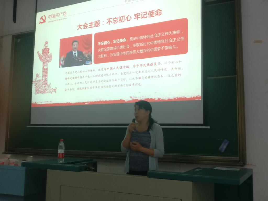 (通讯员 栾淑惠)2018年4月20日下午四点,必赢线路检测3003no1分党校第八期入党积极分子培训班党课第七讲在教三楼208举行。本次党课的主题是“学习贯彻党的十九大精神”,主讲人是机电学院党委书记王海花老师。