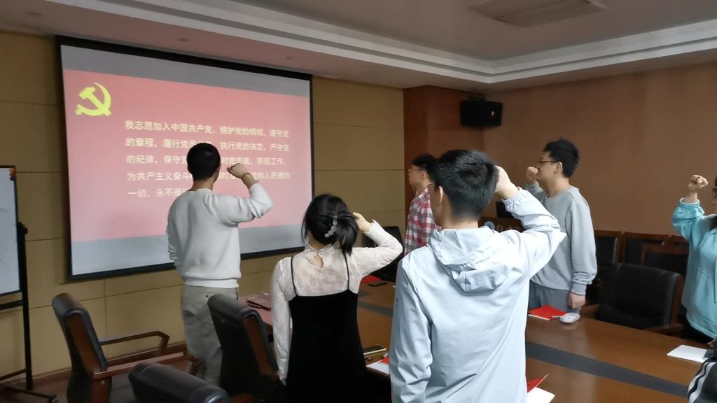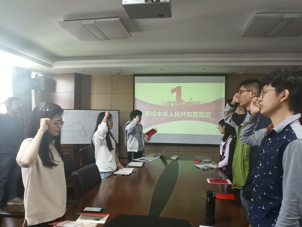 会议第一项,全体同志起立,奏唱中华人民共和国国歌。 会议第二项,全体同志起立,支部书记彭劢带领支部党员重温入党誓词。