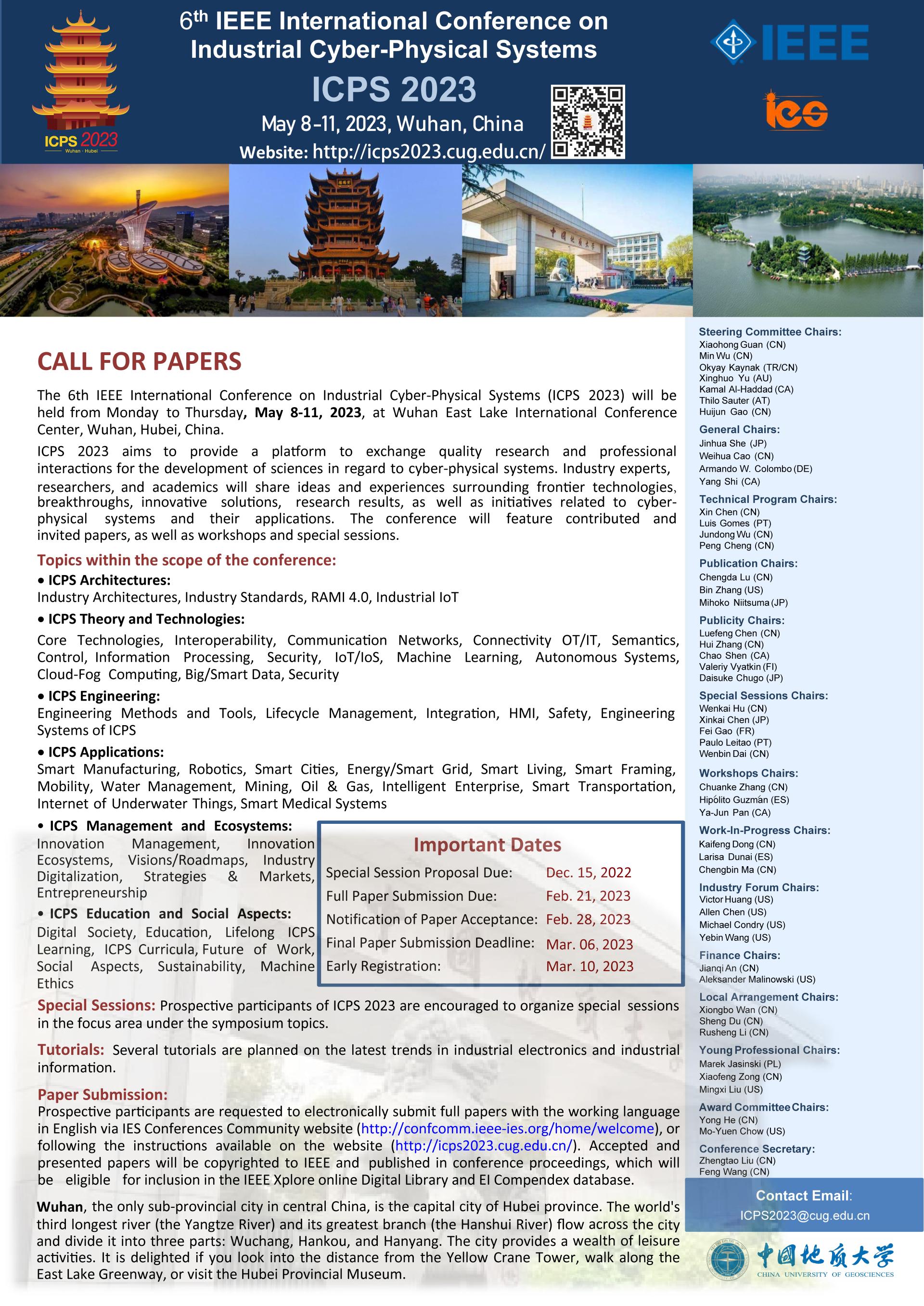 由必赢官网承办的第6届IEEE工业信息物理系统国际会议(ICPS 2023)将于2023年5月8日至11日在武汉东湖国际会议中心举行。会议网站:http://icps2023.cug.edu.cn