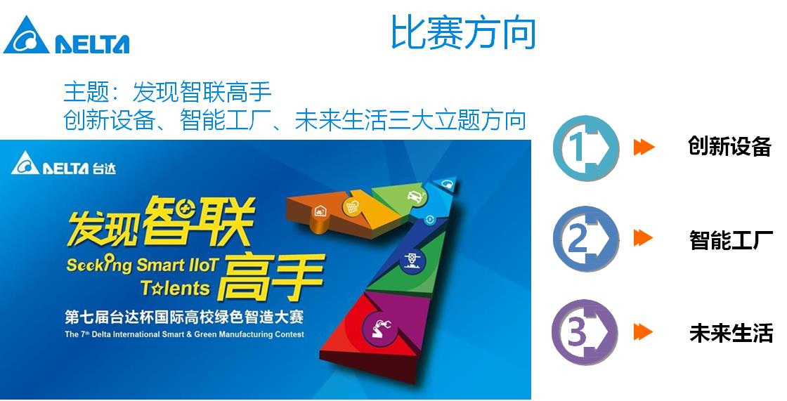 大赛紧扣“工业4.0”和“中国制造2025”先进工业自动化发展方向,以台达的自动化技术和产品为基础,对生产过程优化、管理决策效率提升、品质提升改善、能耗节约、故障诊断分析预处理、绿色环保等方面提出解决方法。从产业新技术,新工艺,新应用角度出发,体现智能化、网络化、物联网、大数据等功能,面向未来,发挥想象力和创造力,以创新设备、智能工厂和未来生活为立题方向。
