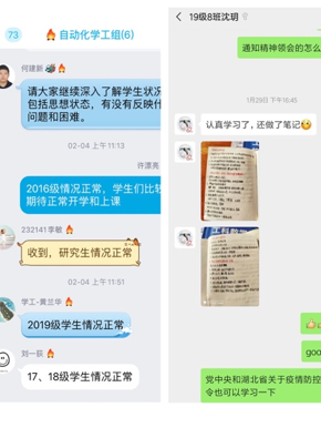 疫情发生时,学院全部学生都已离校回家,大多数教职工也都离开武汉。无论身处何方,学院工作组老师每天都通过微信、QQ和电话保持与师生的紧密联系。1月23日,家住陕西绥德的硕士研究生张同学出现严重不适症状住院,当天中午学院党委副书记何建新老师就电话联系本人予以慰问,与其导师、同学联系进行排查。大年三十晚上,何建新老师还一直通过微信与学生保持联系,鼓励问候,直到晚上十点收到医院检测结果排除新型肺炎的消息。2月5日家住河南固始的研究生程同学发热入院,最后被确诊为新型冠状病毒感染病例。学院院长吴敏老师第一时间与其联系,深入了解情况,期间又多次表达慰问,鼓励其积极配合治疗。随着各地防控措施加强,一些学生出现了焦虑不安情绪。学院辅导员逐一与他们谈话进行心理疏导,耐心解释疫情防控的各项管理规定。2月7日学院发布了致全体学生、家长的一封信,大大鼓舞了广大学生和家长坚持疫情防控的信心和勇气。对滞留在外的教职工,学院通过各系、中心每天保持联系,主动了解他们生活方面的困难并积极提供帮助。