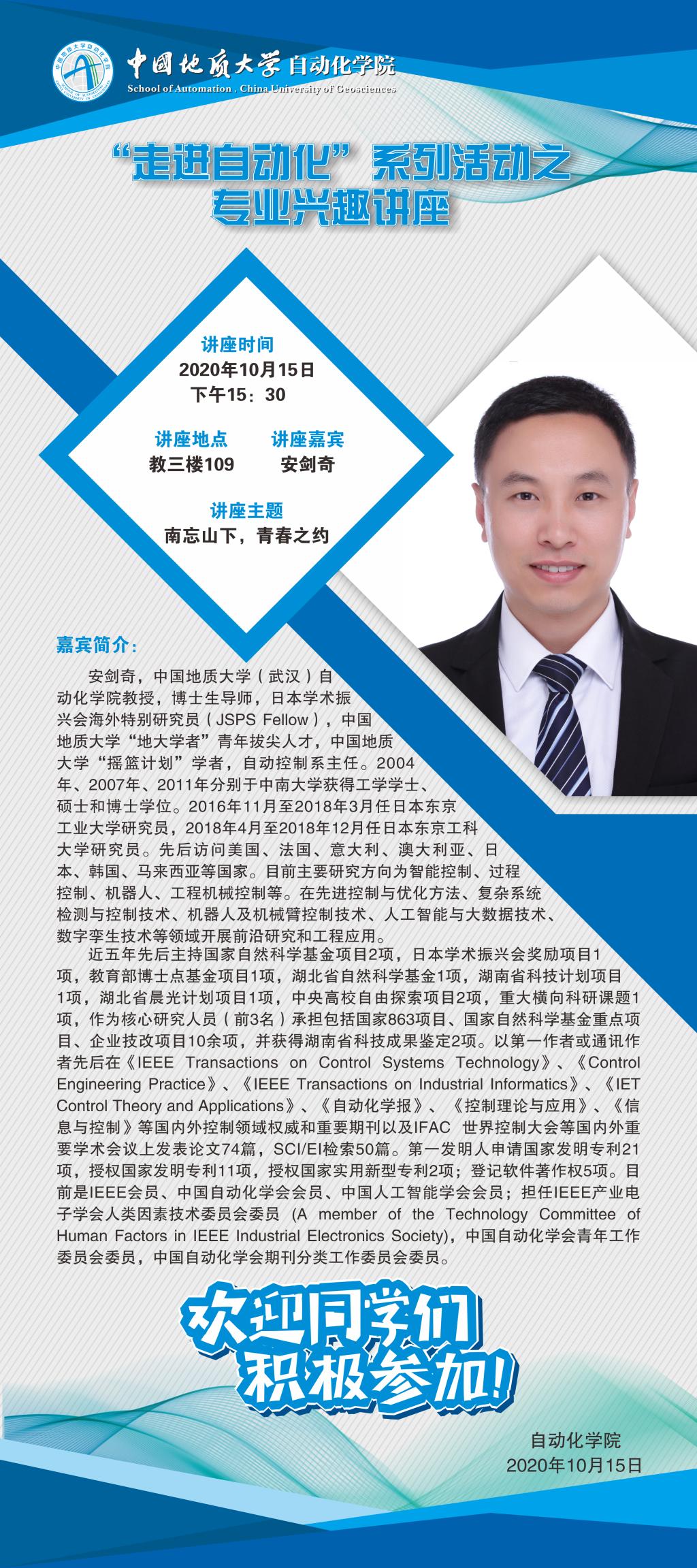 必赢线路检测3003no1首届“走进自动化”活动开幕式将于10月15日下午15:00在教三109举行,在开幕式后将进行系列活动第一项,专业兴趣讲座。邀请到必赢官网安剑奇老师进行主题为“南望山下,青春之约”的讲座。本次“走进自动化”系列活动将历时两个半月,共分为开幕式、师生交流、教育实践、成果展示、闭幕式五大板块展开,帮助同学们更好的了解必赢线路检测3003no1,在全院范围内营造创新实践的良好氛围。欢迎老师、同学们积极参与!