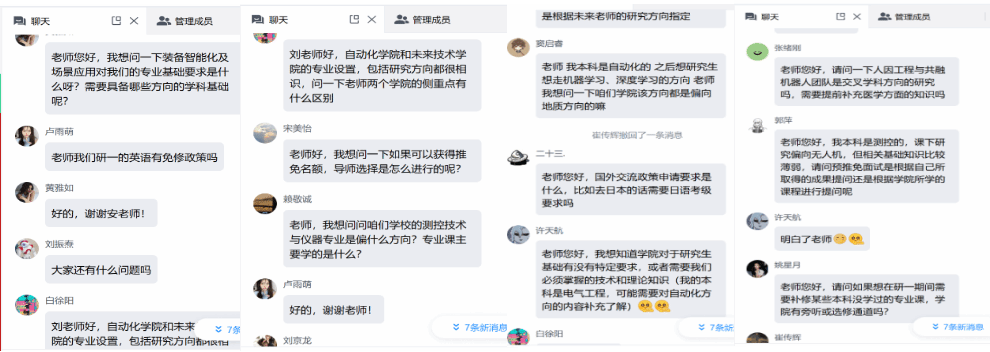 在师生交流互动阶段,同学们通过实时弹幕和连麦功能踊跃提问,内容涵盖研究生培养环节细节、国际联合培养机遇、未来就业前景、研究方向选择等多个方面。在线的学院领导和团队导师代表耐心倾听,逐一细致解答。