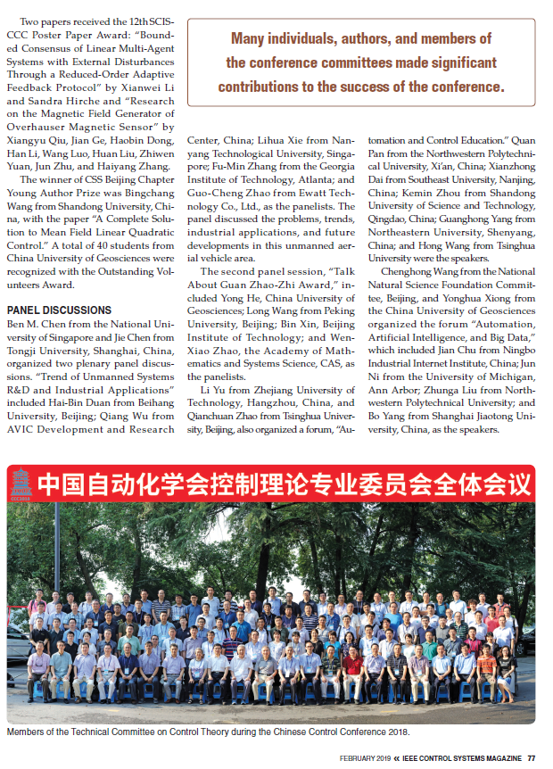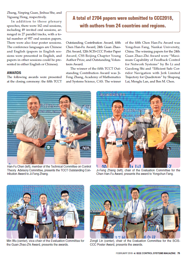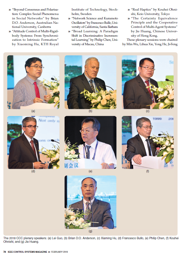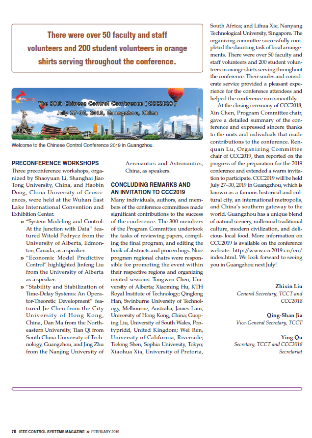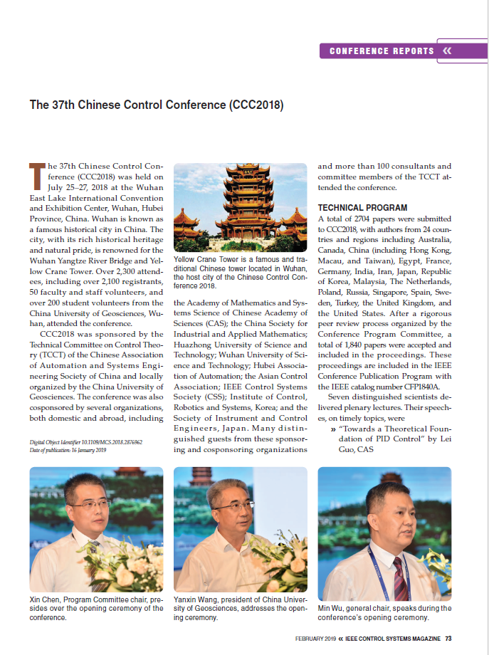 2018年7月25日至27日,由必赢官网承办的第37届中国控制会议(CCC2018)获得圆满成功。本次会议受到国际学界关注,国际知名期刊《IEEE Control Systems Magazine》对会议作了大篇幅报道。