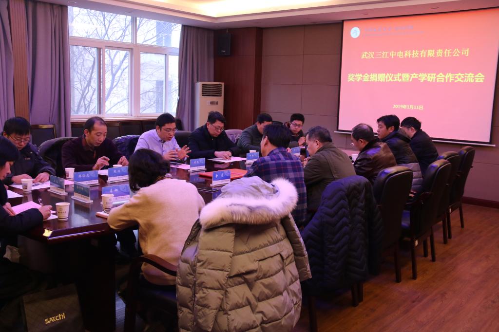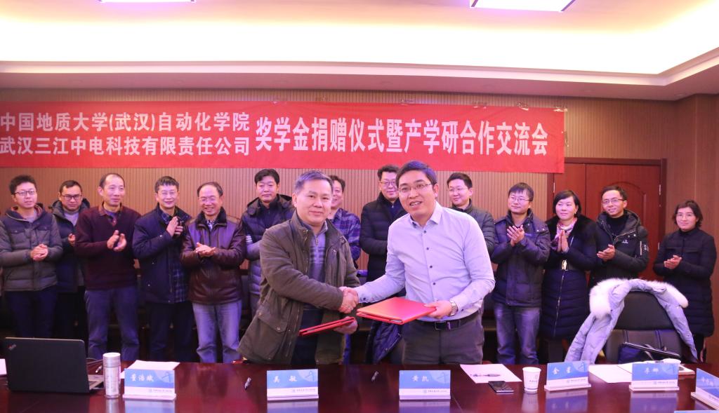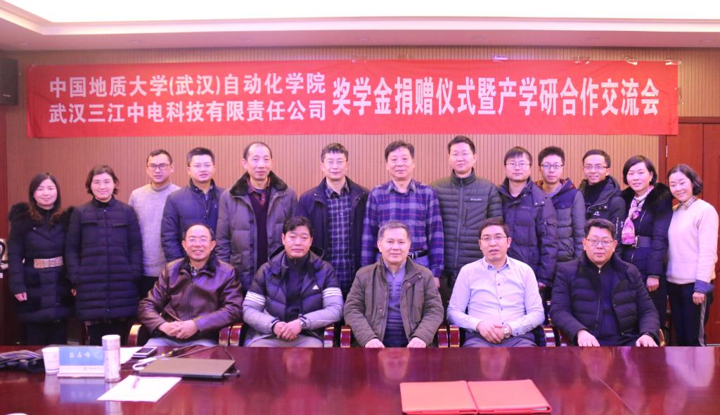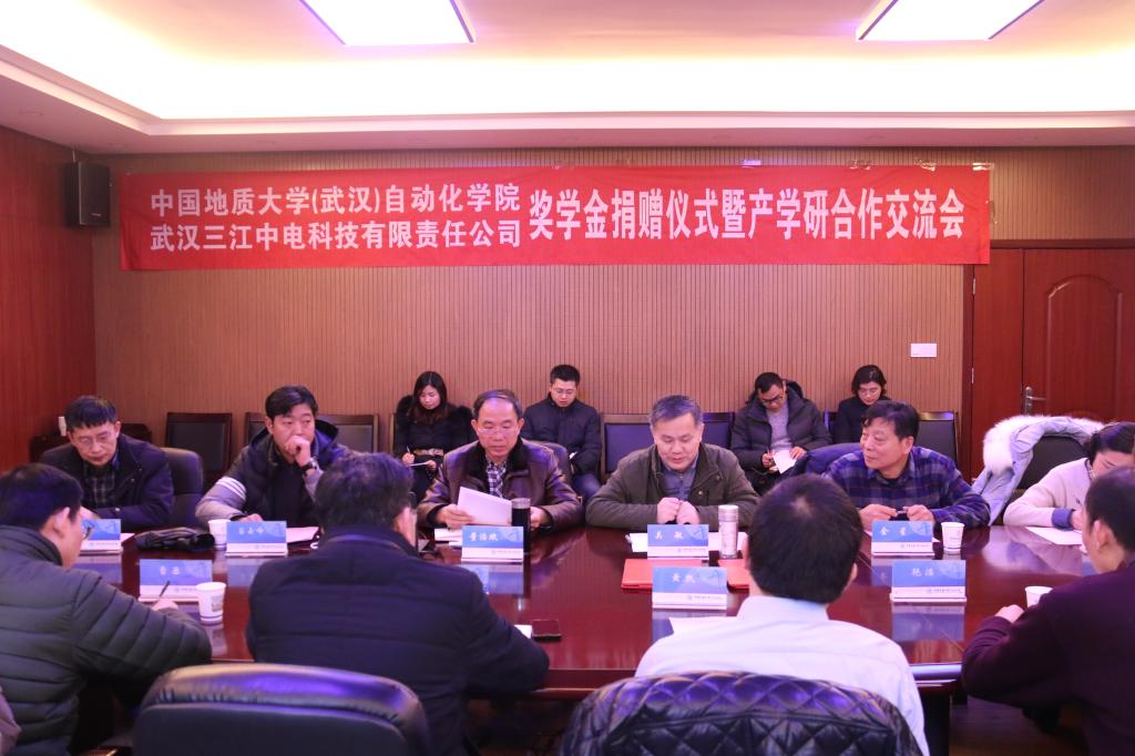 董浩斌书记代表全院师生对武汉三江中电科技有限责任公司的捐赠表达感谢和敬意期待双方在智能控制领域紧密合作和互补吴敏院长充分肯定该公司为中国教育奉献的行为和双方的合作前景他为嘉宾介绍学院的师资规模高端人才研究力量以及在智能电网机器人等方面成功应用案例武汉三江中电科技有限责任公司黄凯董事长发言他介绍了企业的业务领域希望校企双方彼此加深了解在优化技术核心产品方面深入合作我校校友工作与教育基金管理处吕占峰副处长作了发言对三江中电捐资助学表示感谢