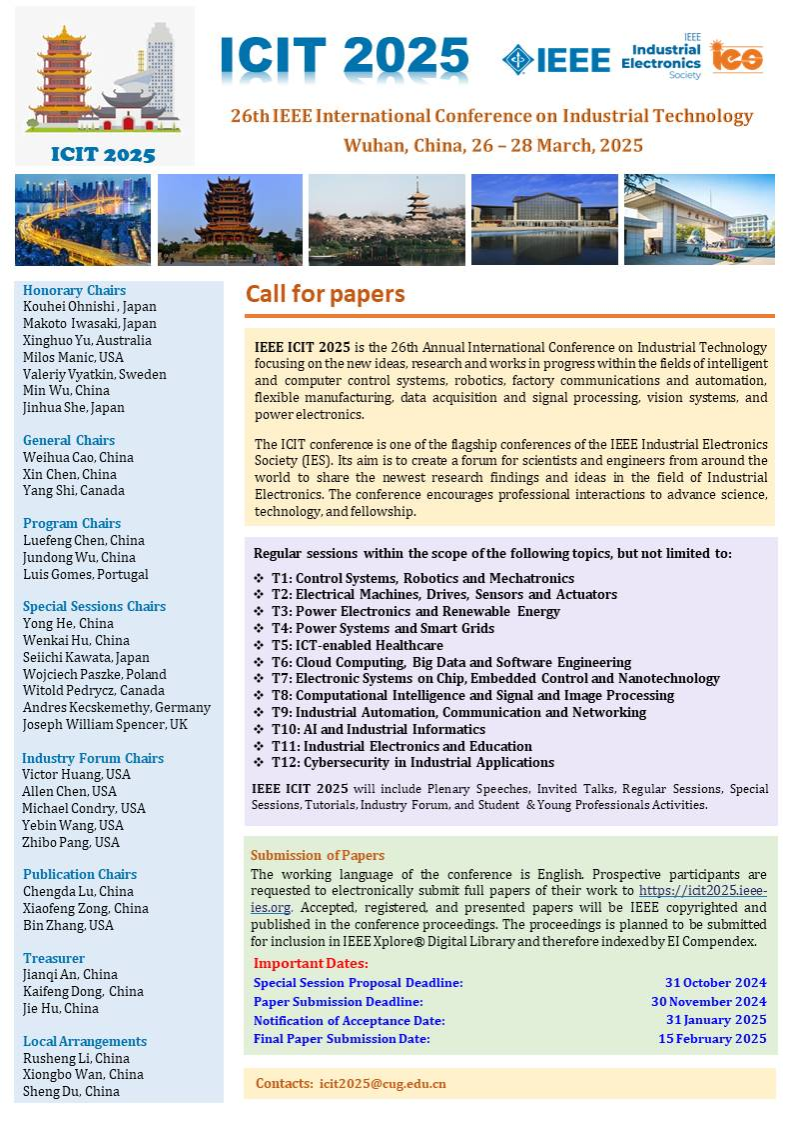 26IEEE国际工业技术大会(ICIT2025)将于2025326日至28日在中国武汉举办,由必赢线路检测3003no1承办。ICIT2025重点关注智能和计算机控制系统、机器人技术、工厂通信和自动化、柔性制造、数据采集和信号处理、视觉系统和电力电子等领域的新思想、新研究和新进展。