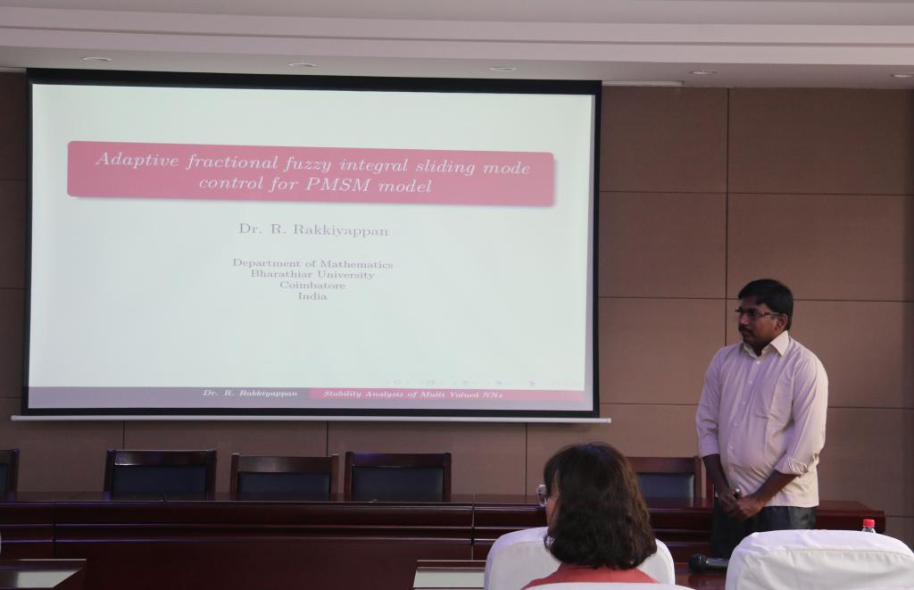 5月30日,印度巴拉蒂尔大学助理教授Rakkiyappan Rajan来必赢官网作了题为《Adaptive fractional fuzzy integral sliding mode control for PMSM model》的学术报告。