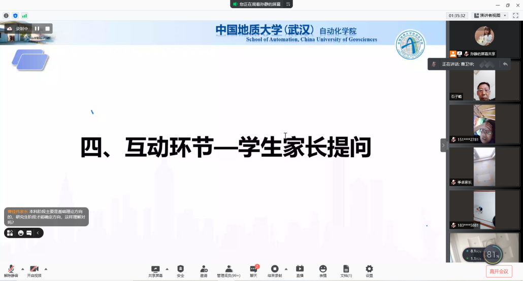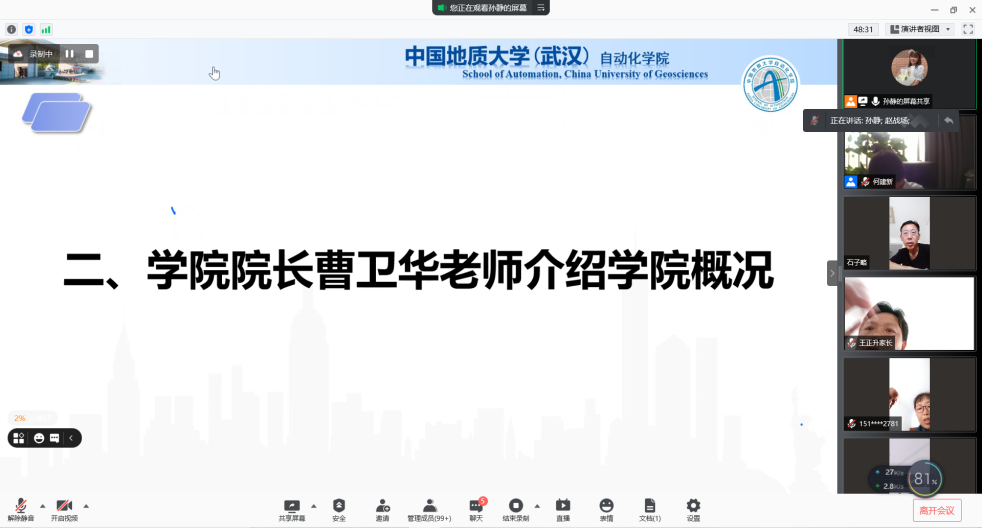 2021年9月4日上午10点,必赢线路检测3003no1召开2021级新生家长线上座谈会。院党委书记董浩斌老师、院长曹卫华老师、院党委副书记何建新老师、副院长陈鑫老师、副院长宗小峰老师、副院长熊永华老师、副院长陈略峰老师、自动控制系系主任安剑奇老师、测控技术与仪器系系主任董凯锋老师、智能系统研究所所长刘振焘老师以及其他老师参加本次座谈会。学院召开此次新生家长座谈会旨在更好促进家校联合,让家长们对学校和学院有更加深入地了解。