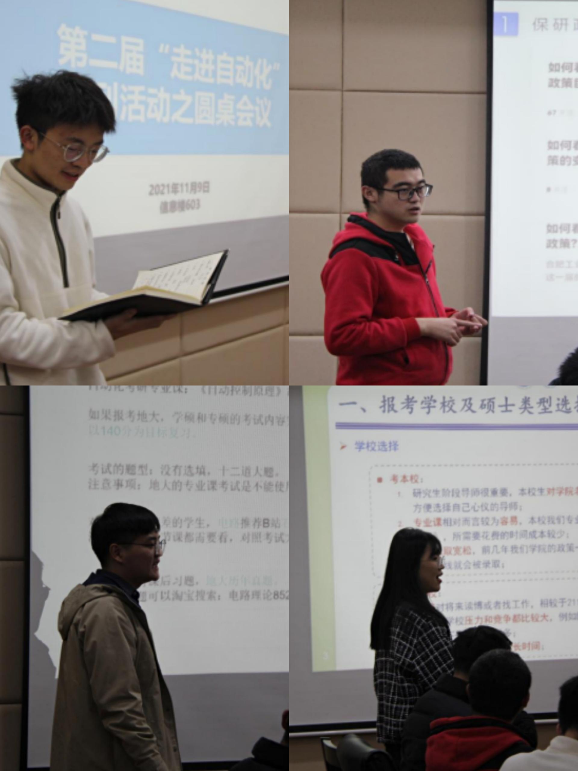 2021年11月9日晚上20:30,必赢线路检测3003no1第二届“走进自动化”系列活动之朋辈引领学习会之圆桌会议——“探寻心中热爱,规划未来蓝图”主题班会在信息楼603举行。本次交流会邀请到了辛浩男、廖宇航、闫晴晴、喻学孚四位高年级同学来做分享,本次活动由231192班长张宇一同学主持,班主任魏龙生老师参加。本次活动旨在促进班级凝聚力,帮助高年级同学进行未来选择的规划,对专业前景、就业方向有一个清晰地认知,并通过这样小范围的深入交流更加具有针对性的为同学们答疑解惑。