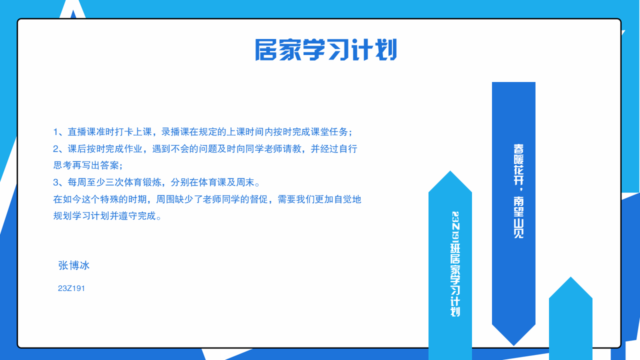 在“停课不停学”这一部分,肖纬琦提出两点要求:一是认真开展线上学习,做到停课不停学;二是居家锻炼,保持正常作息时间。肖纬琦同学强调了课堂纪律,希望大家按时上课签到,学习委员将组织班委抽查部分同学的作业,加强学业监督,提供学习支持,鼓励大家制定科学的学习计划,保证学习质量和效率。居家锻炼是本学期体育课的重要组成部分,将作为同学们体育成绩考评依据,能够帮助大家提高自身免疫力,鼓励大家通过keep等软件打卡锻炼,强健体魄。