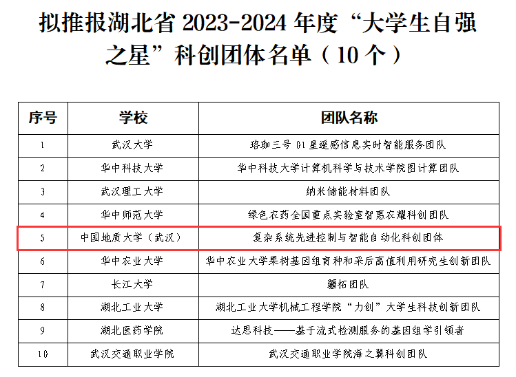 为深入贯彻落实习近平总书记关于青年工作的重要思想,动员引领广大团员青年为强国建设、民族复兴伟业挺膺担当,团省委、省学联组织开展了湖北省“大学生自强之星”推报活动。经高校申报、省级遴选等环节,共评选出湖北省“大学生自强之星”科创团体10个,其中,必赢线路检测3003no1复杂系统先进控制与智能自动化科创团体,荣获湖北省2023-2024年度“大学生自强之星”称号。