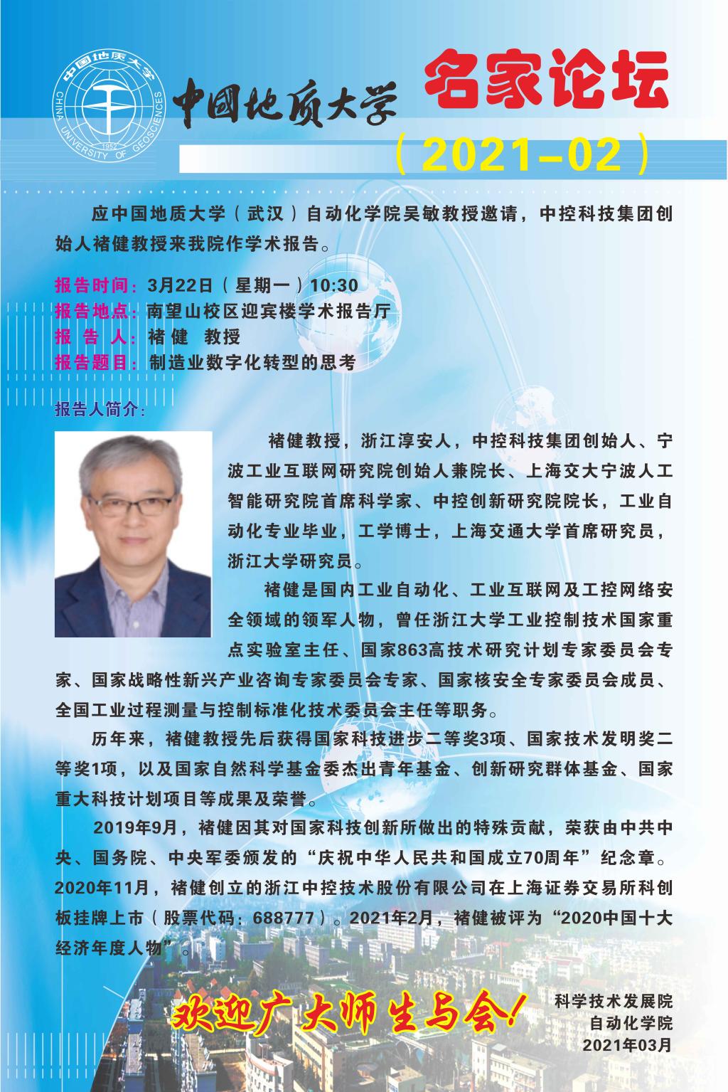 自动化学术论坛[2021第2期]:中控科技集团创始人褚健教授作客地大名家论坛