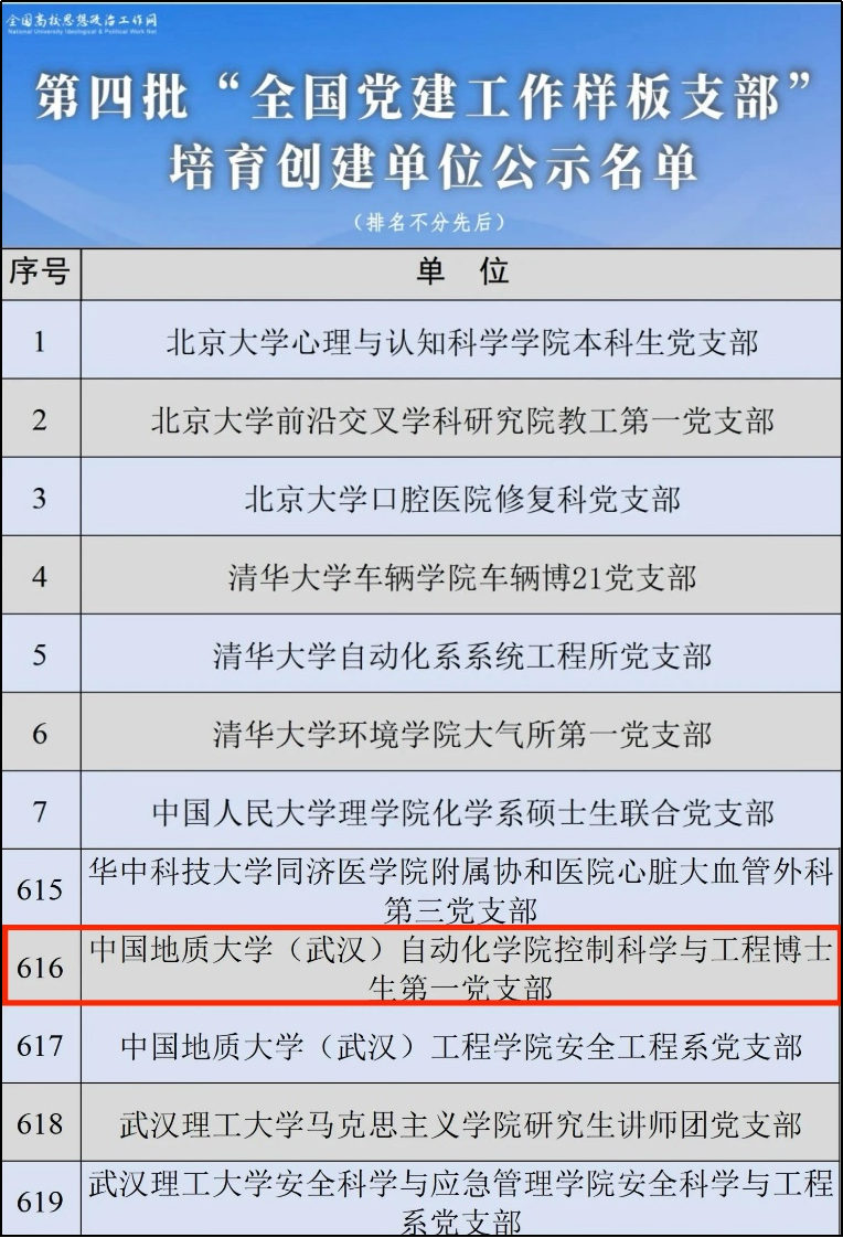 近日,教育部公布了第四批新时代高校党建示范创建和质量创优培育创建单位名单,其中,必赢线路检测3003no1控制科学与工程博士生第一党支部作为学校首个研究生党支部创建单位,入选“全国党建工作样板支部”,也是支部继2022年入选首批湖北省高校党建工作样板支部培育创建之后,党建工作取得的新成绩。