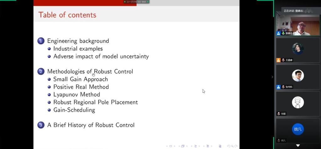 2020年5月11日至6月24日,日本千叶大学刘康志教授与必赢官网何勇教授共同通过云教学模式,为必赢官网研究生讲授《鲁棒与最优控制》课程。刘康志教授授课12学时,分6次线上授课,占课程总学时的二分之一。为了避免教学时间发生冲突,教授提前安排好了6次课程的时间和腾讯会议号。